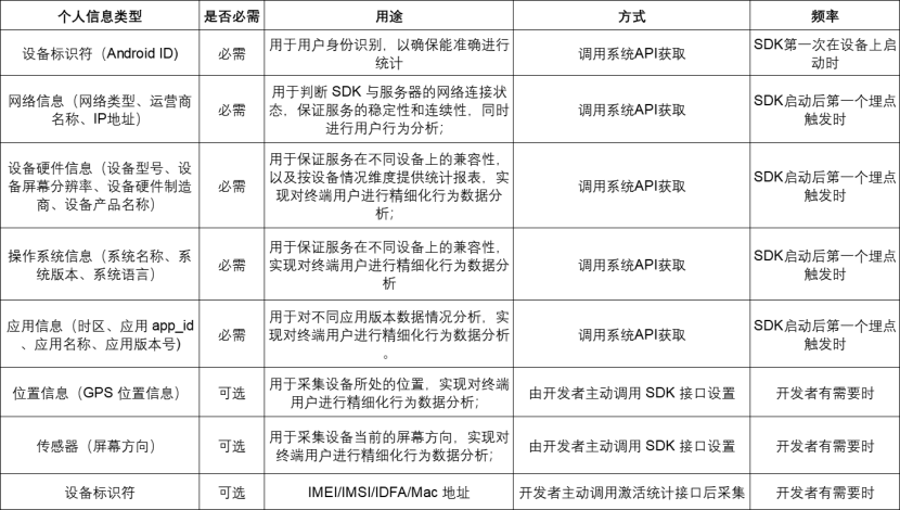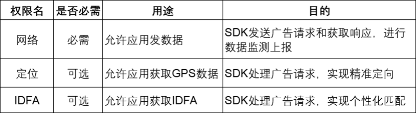 基础功能:在开发者应用中进行广告投放,包括广告展示、广告监测、广告归因、广告效果优化,以及应用程序运行过程中的启动、关闭、广告曝光、点击等用户行为数据监测。